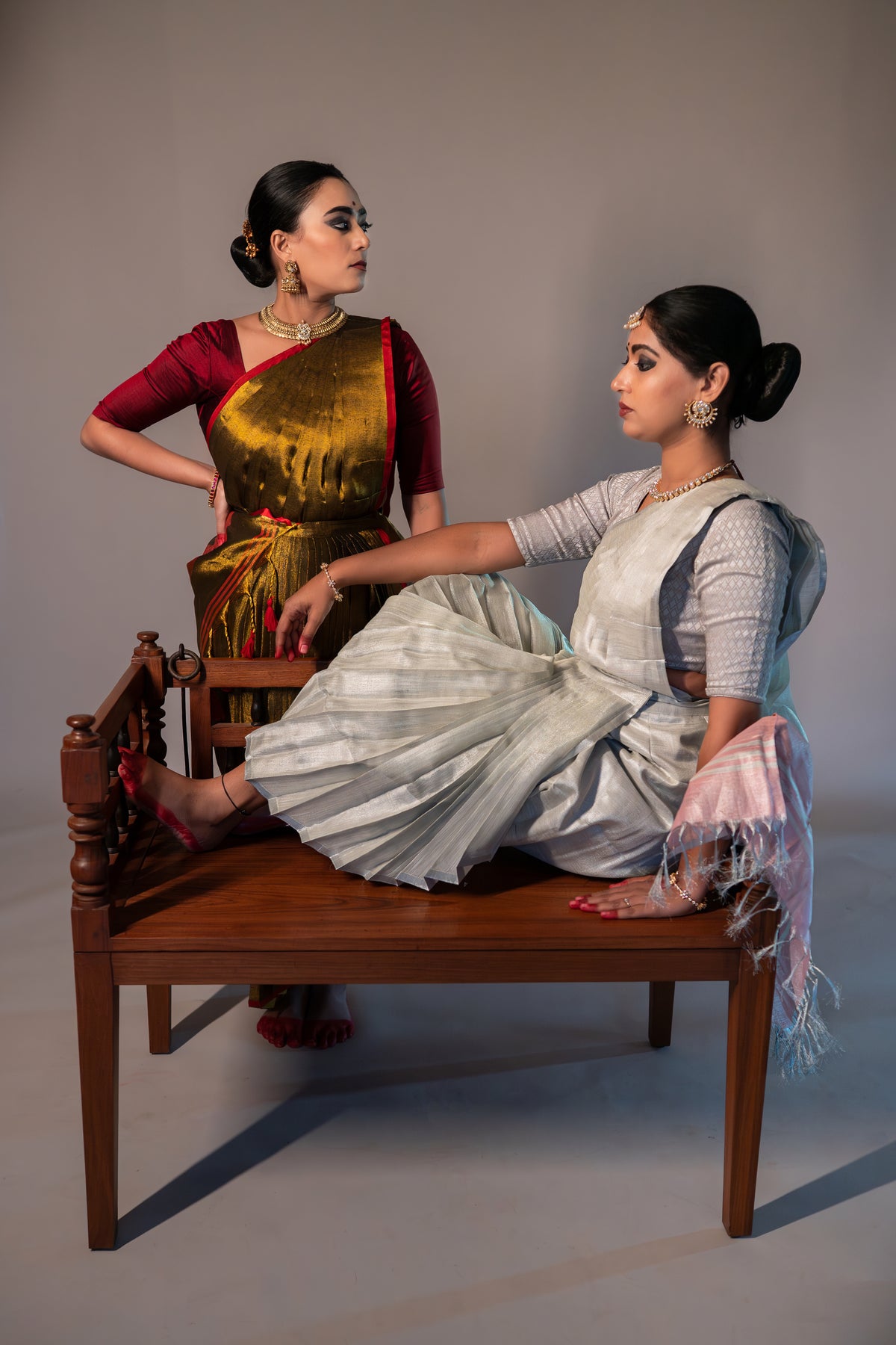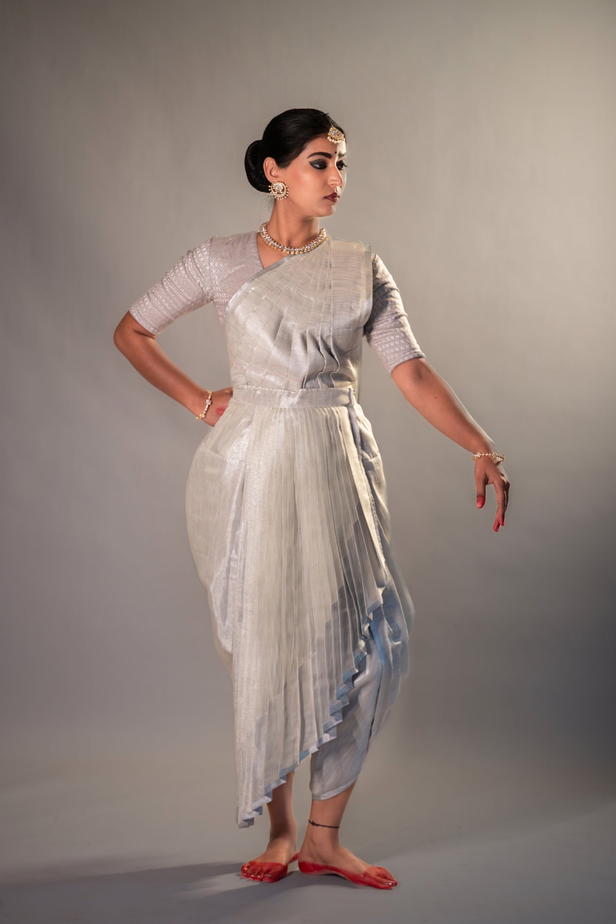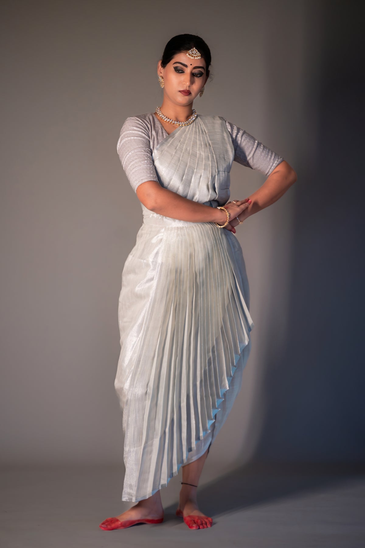 This Metallic Two-Tone Tissue Silk Dance Dhoti Costume is specially designed for classical dance performances, combining elegance with comfort. Crafted from lightweight tissue linen with a refined metallic finish, it offers a graceful two-tone shimmer that enhances movements under stage lighting. The fabric allows ease of motion while maintaining a structured, traditional silhouette.