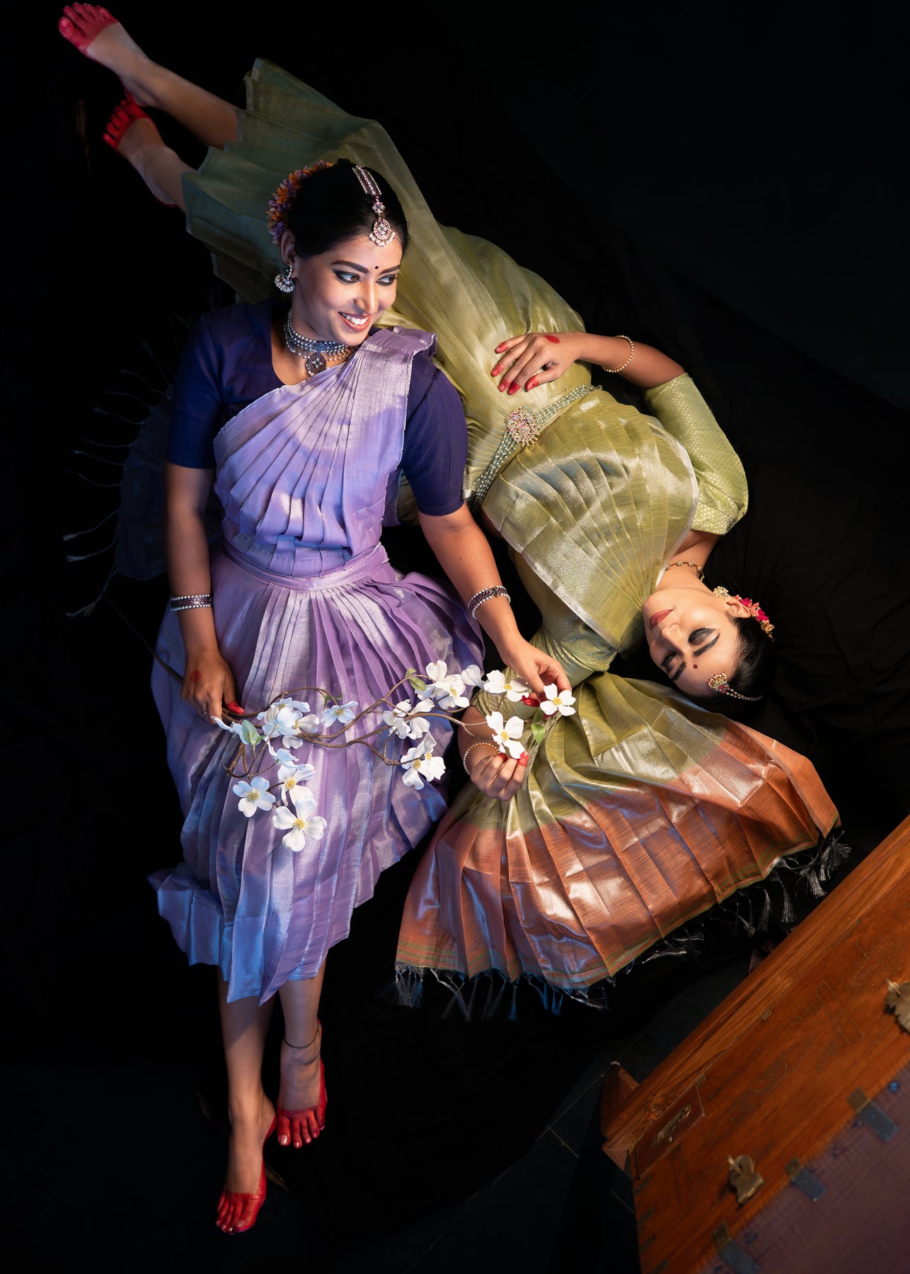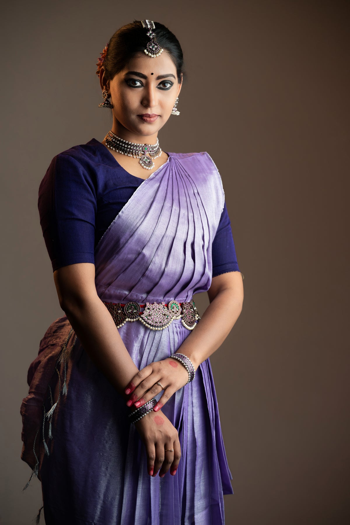 This Metallic Two-Tone Tissue Silk Dance Dhoti Costume is specially designed for classical dance performances, combining elegance with comfort. Crafted from lightweight tissue linen with a refined metallic finish, it offers a graceful two-tone shimmer that enhances movements under stage lighting. The fabric allows ease of motion while maintaining a structured, traditional silhouette.