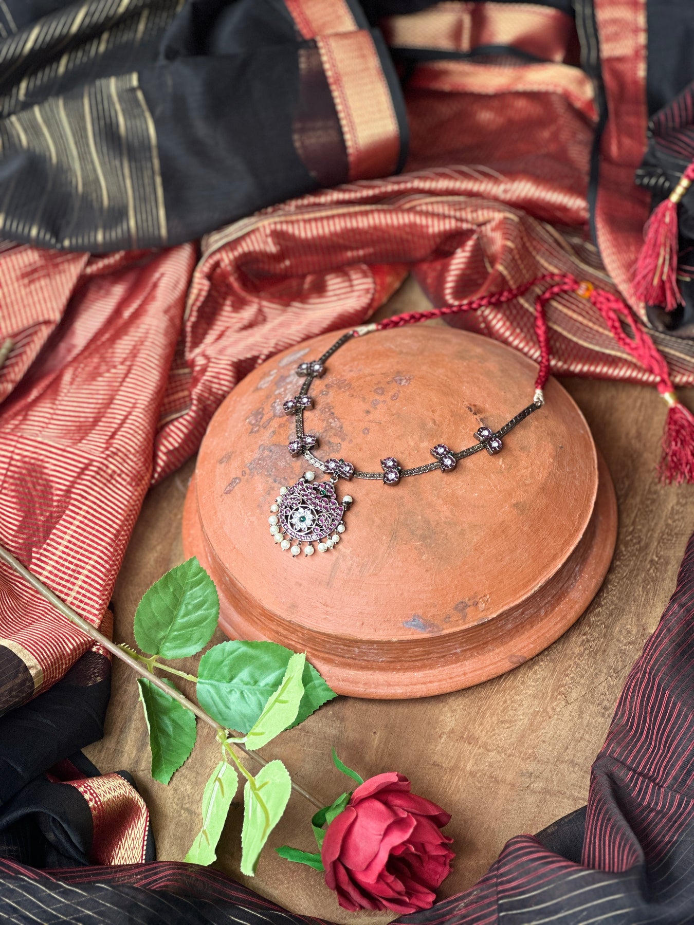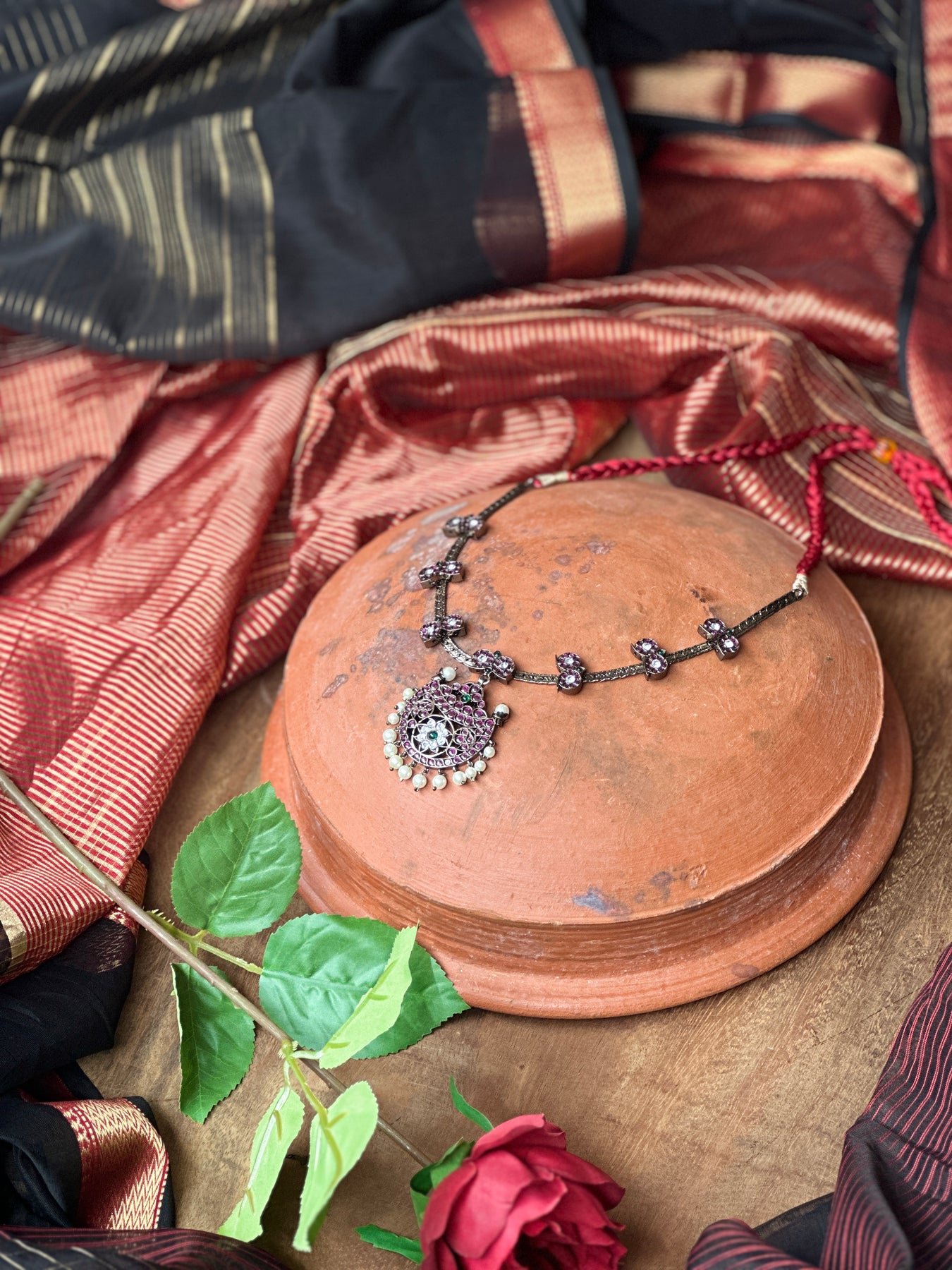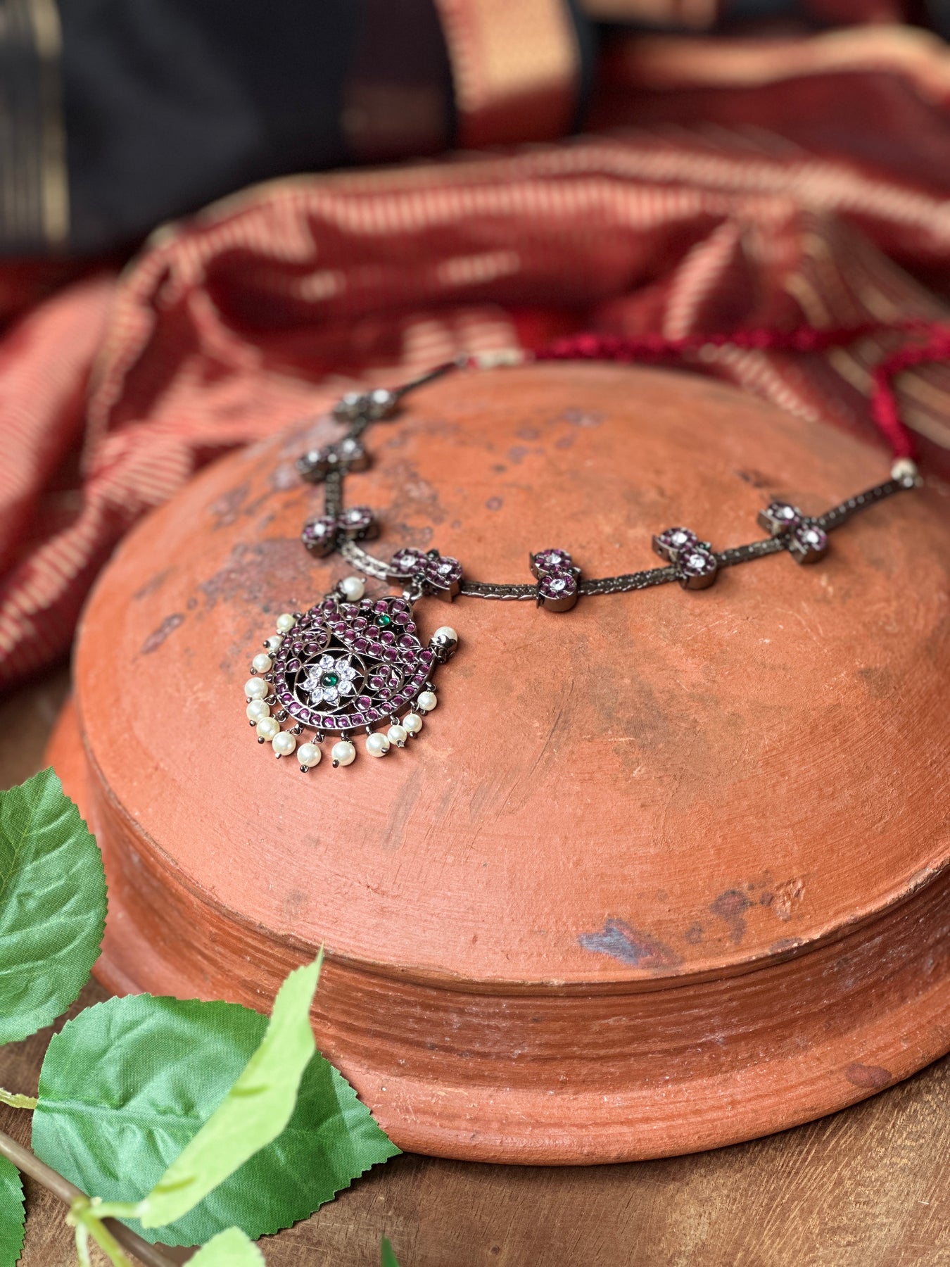 Adorned with lab-grown or imitation stones for a rich antique finish