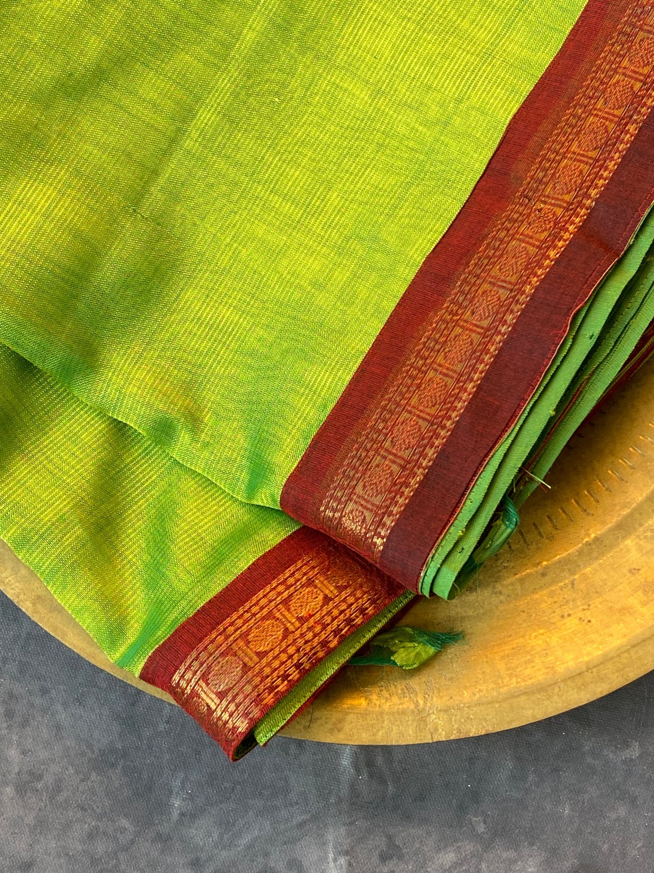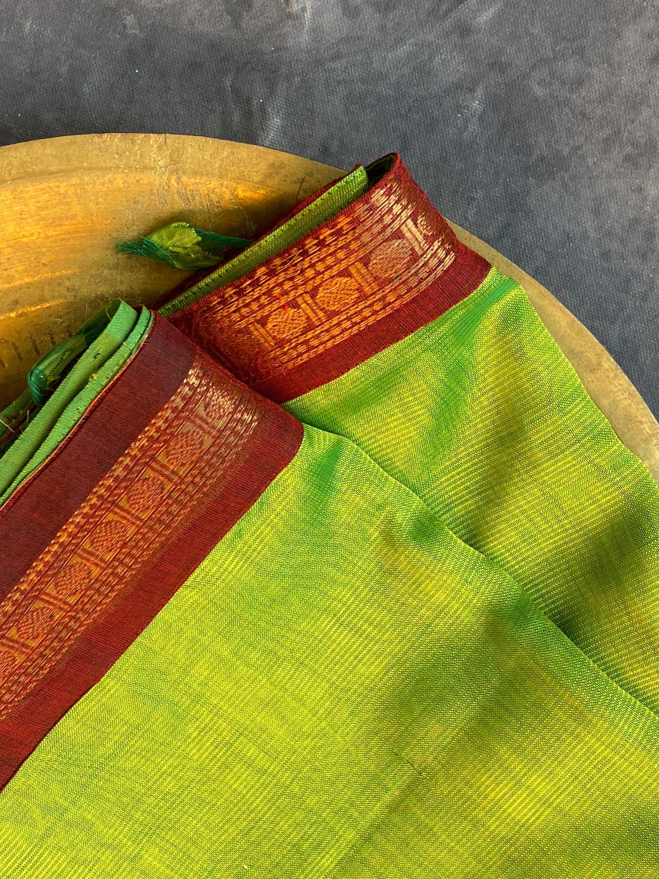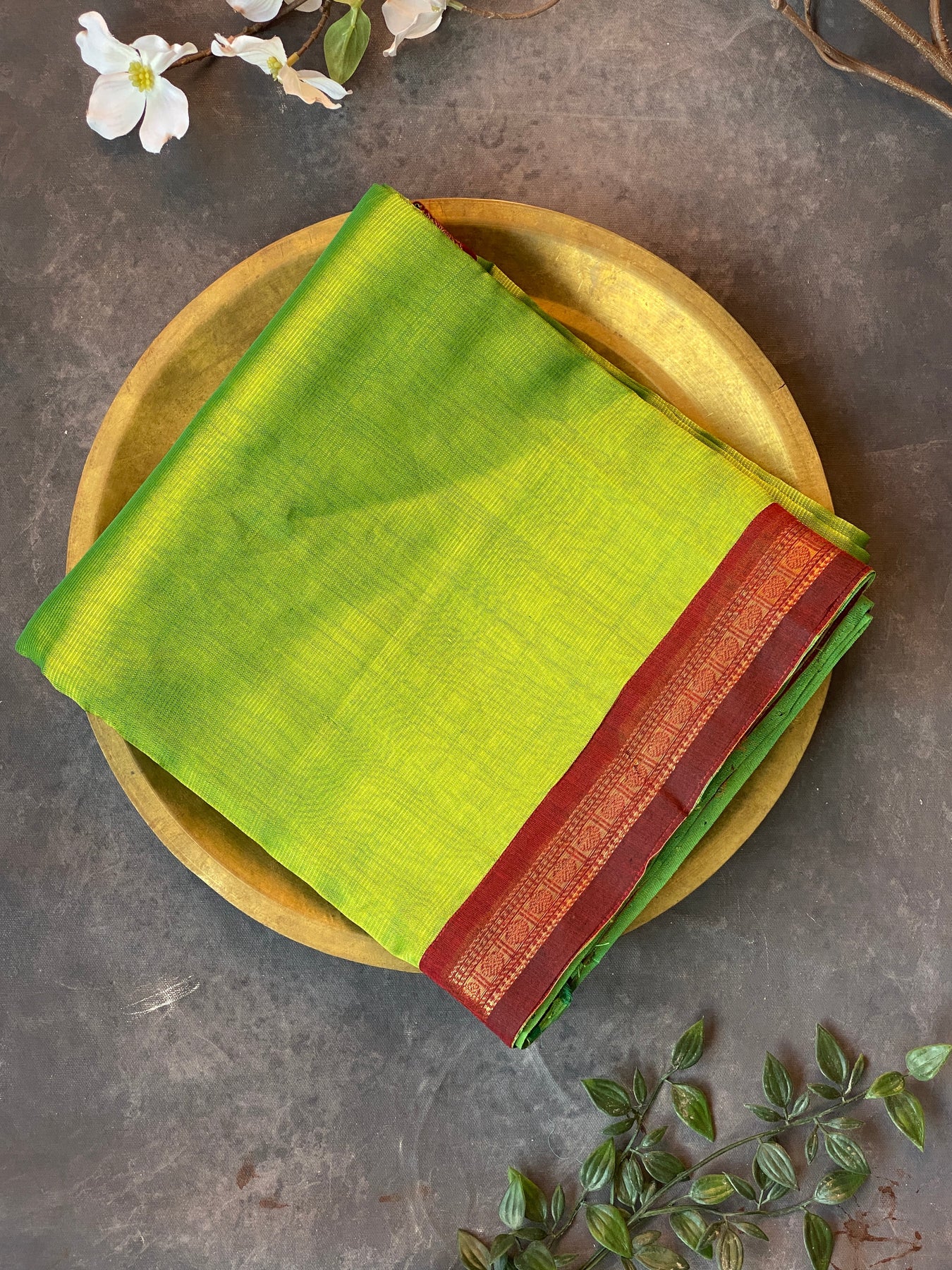 Lightweight and easy to drape, the saree allows free movement during long practice sessions while maintaining a graceful fall. The fabric absorbs sweat well, making it ideal for daily rehearsals. with classic Kanchi borders, it reflects timeless tradition with practical functionality