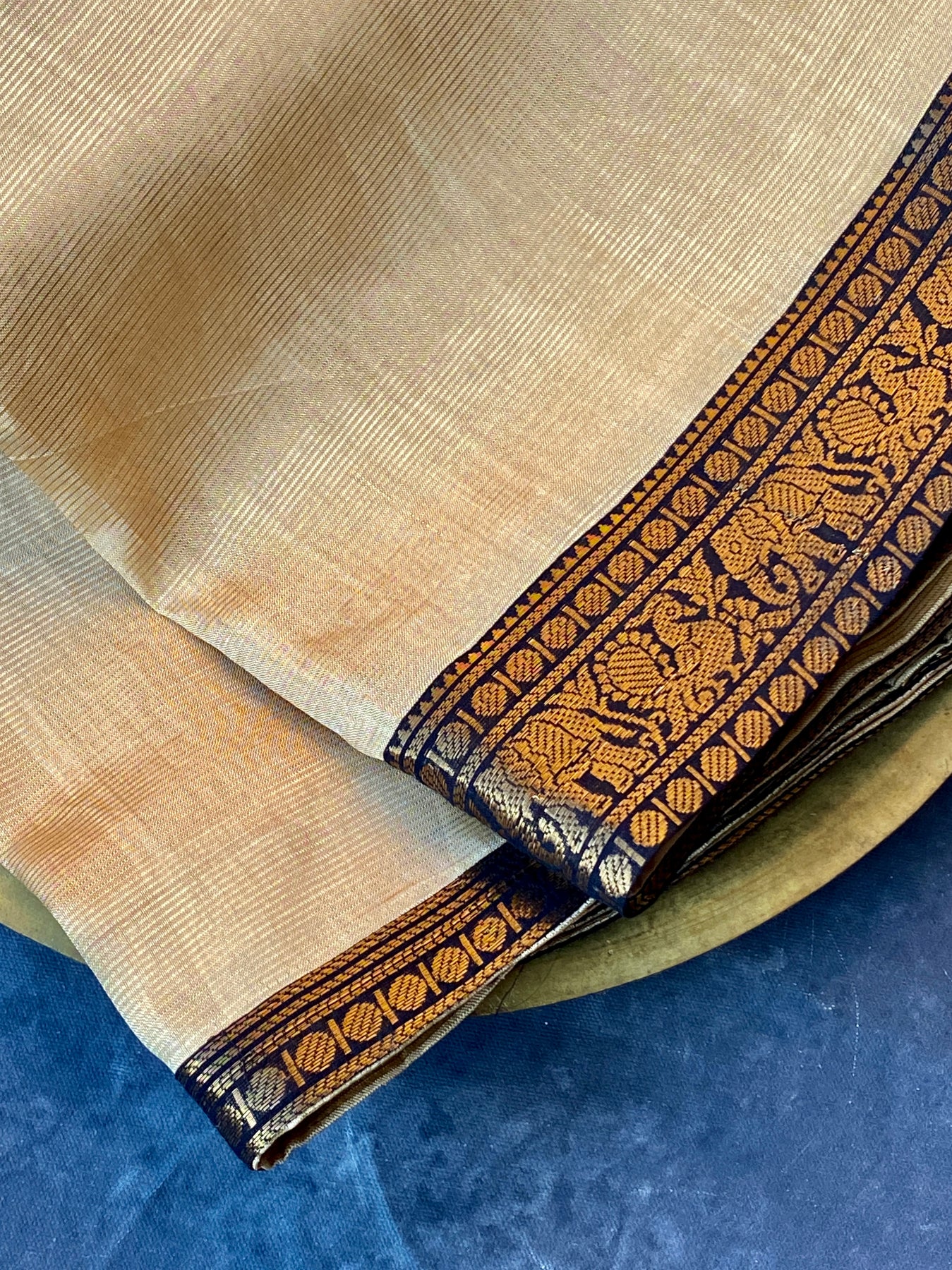 The modest looms in the Andhra town of Mangalgiri produce a distinct style of fabric with high thread density per square inch, ranging from 40 (coarse) to 120 (superfine), sometimes more. The characteristic hand-embroidered zari is reminiscent of the nizam influence.