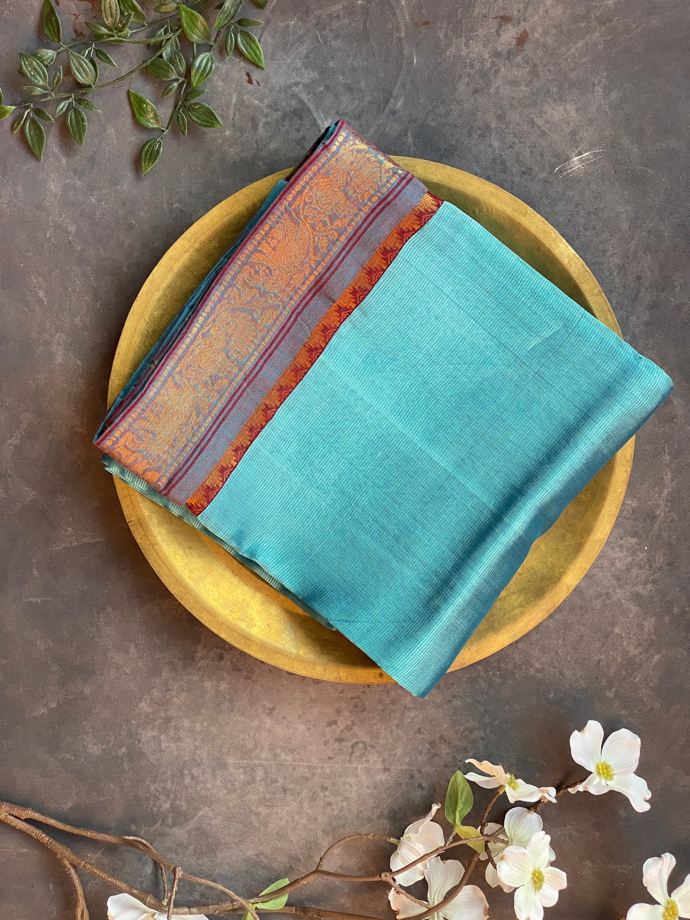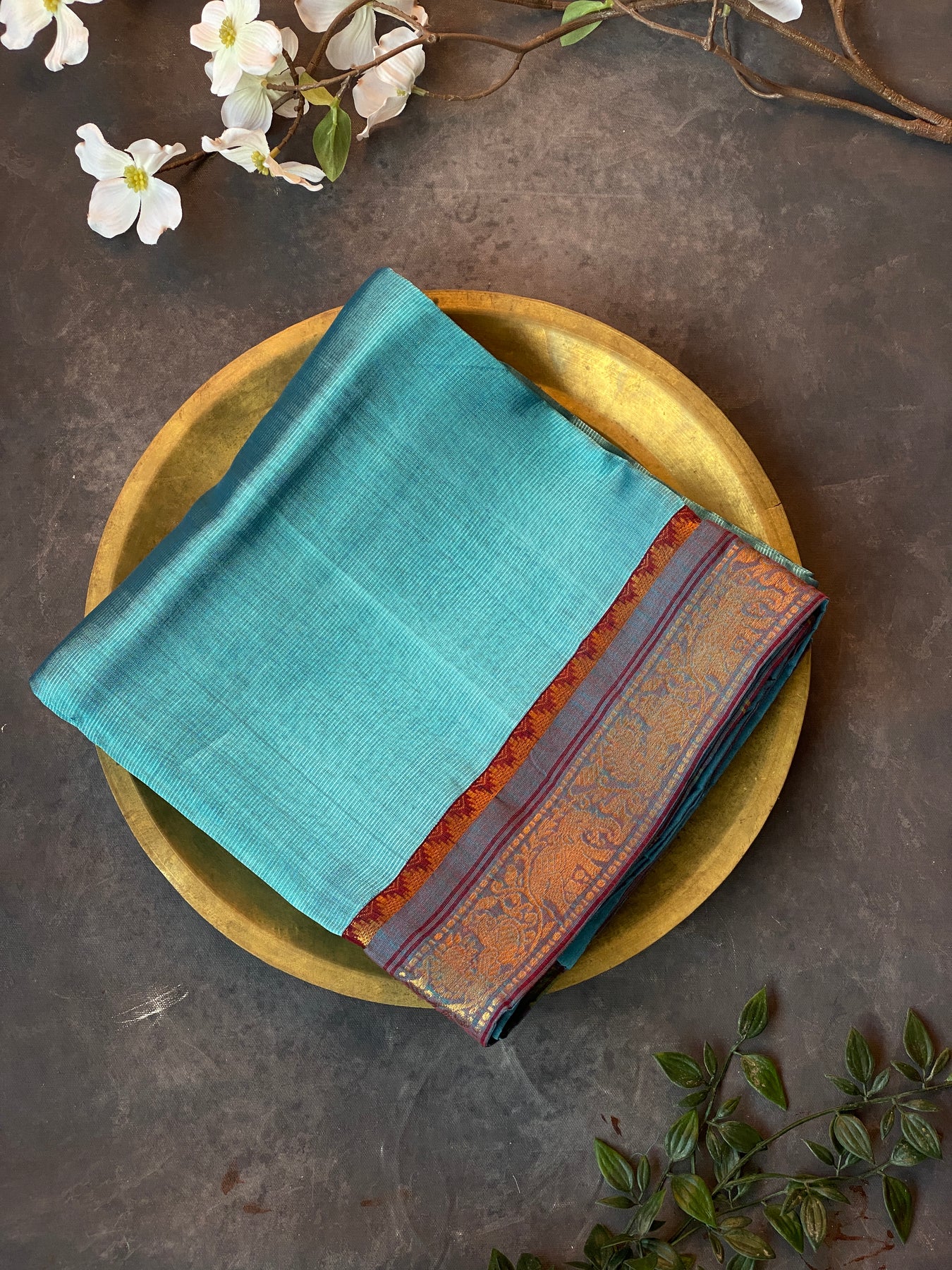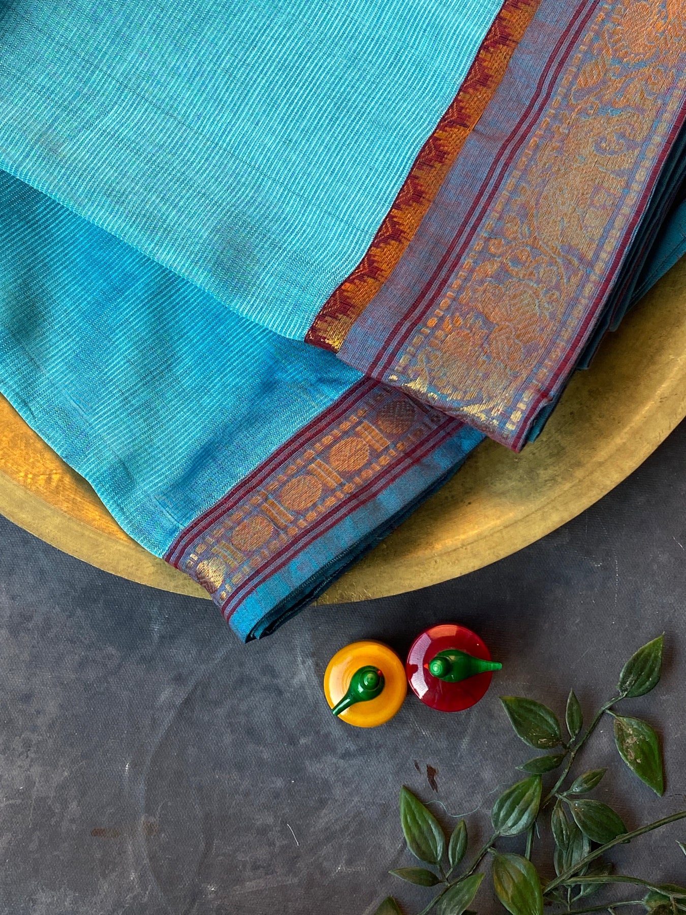 Lightweight and easy to drape, the saree allows free movement during long practice sessions while maintaining a graceful fall. The fabric absorbs sweat well, making it ideal for daily rehearsals. with classic Kanchi borders, it reflects timeless tradition with practical functionality