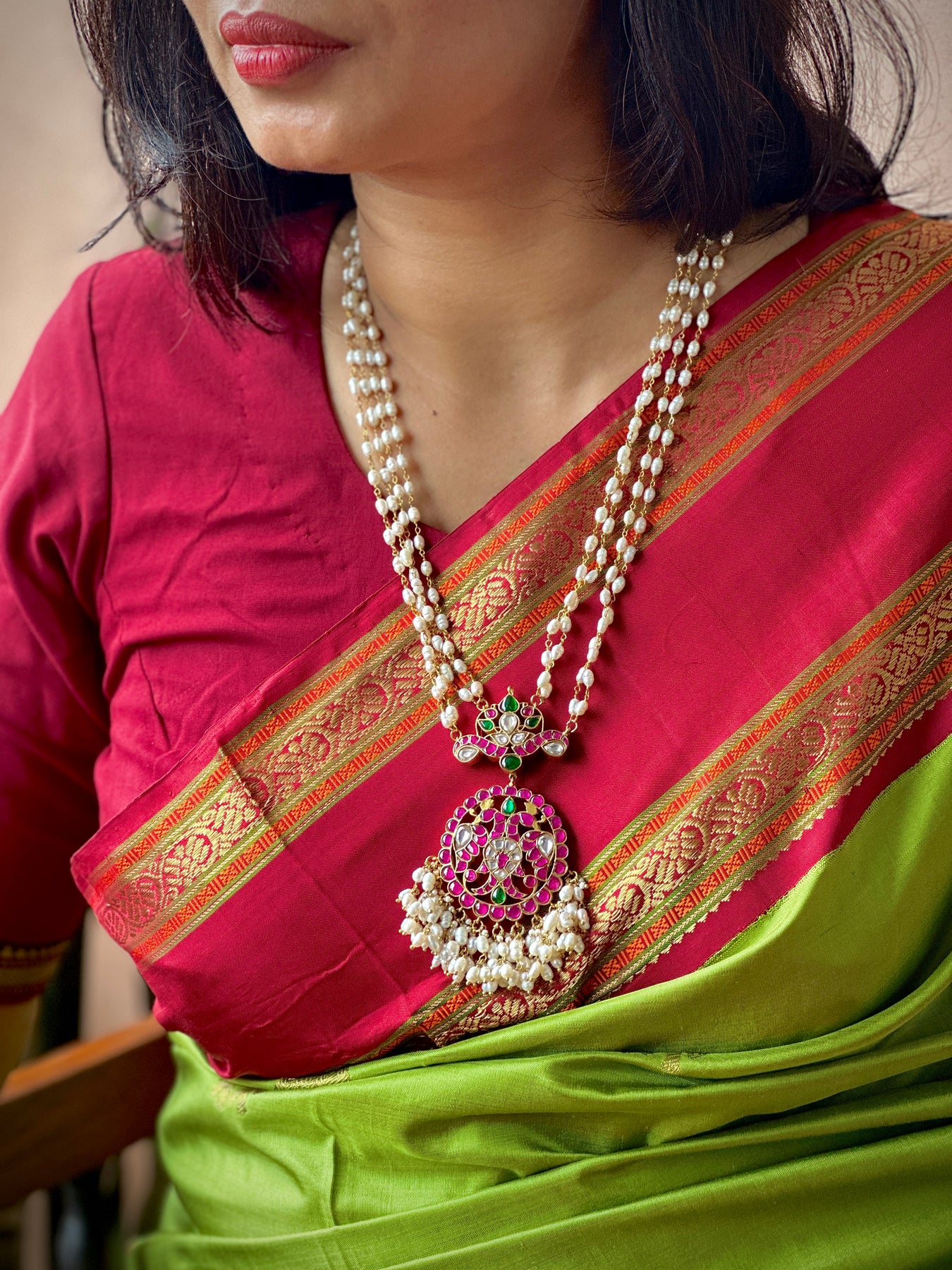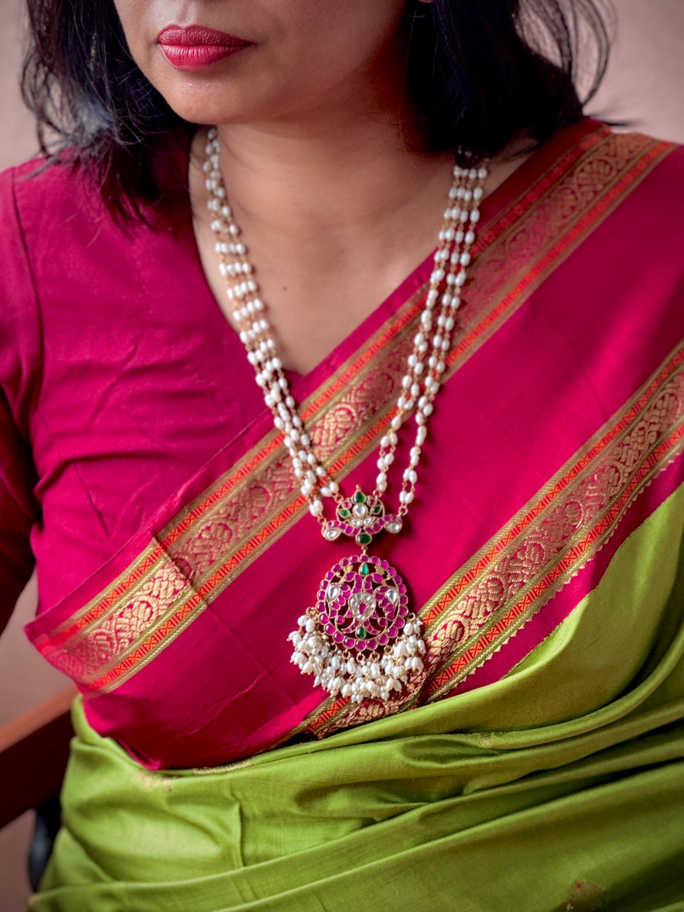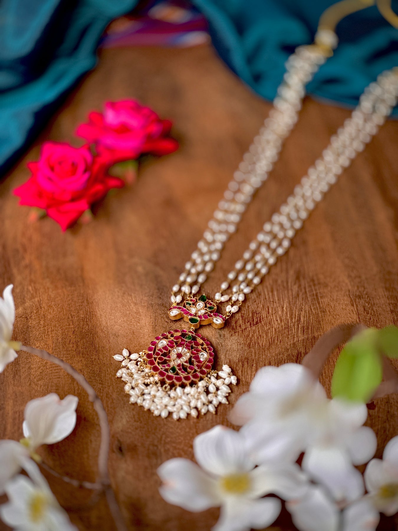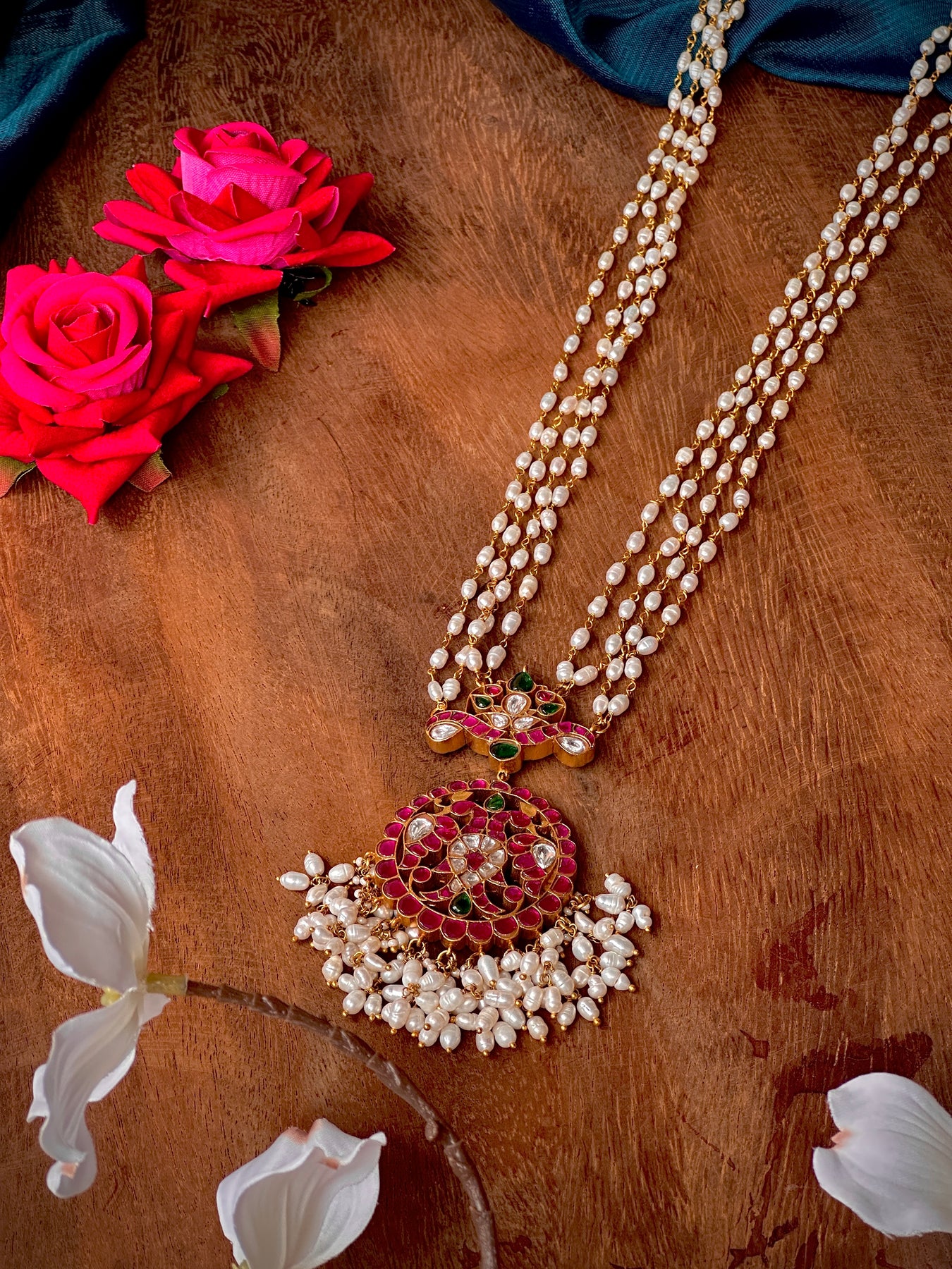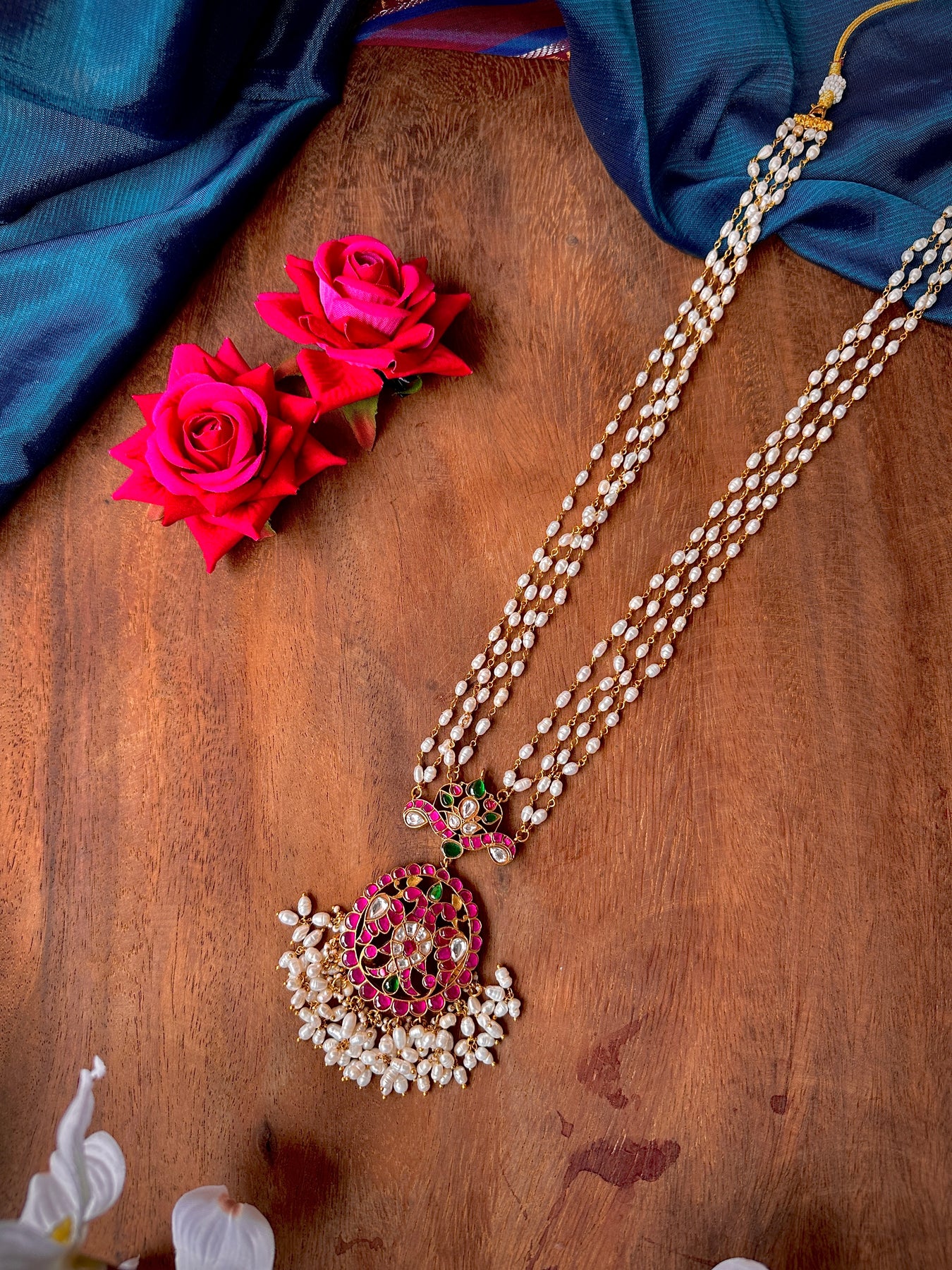 Pearl lovers, a regal four-layer rice pearl the pendant is highlighted with an elaborate pearl cluster at the base, adding a rich and luxurious touch. The combination of traditional design elements with rice pearls makes this piece perfect for weddings, festive occasions, and grand celebrations.