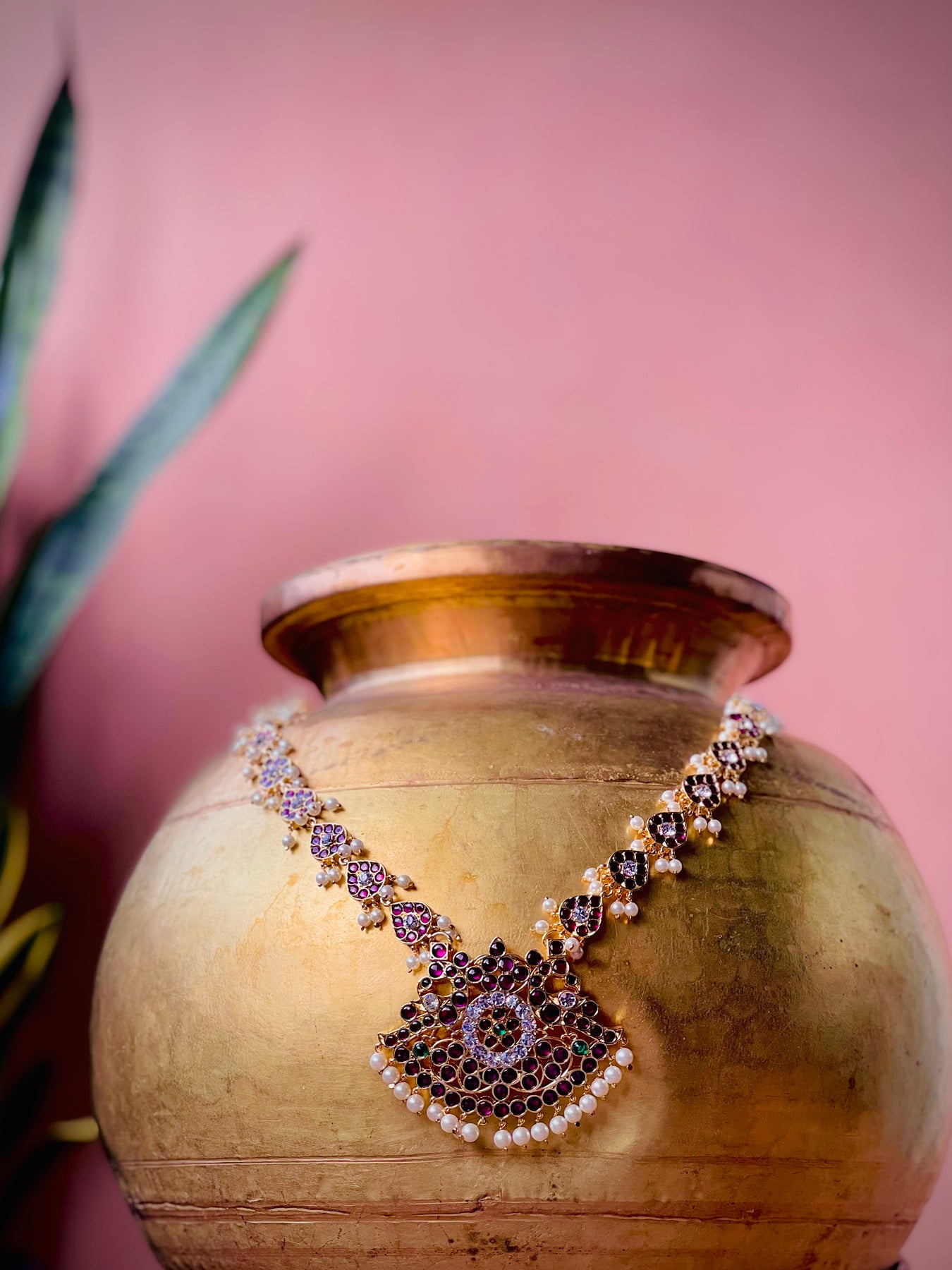 Regular price Rs. 28,275.00Elegant South Indian long chain (haram), a classic temple jewellery piece worn in Bharatanatyam and Kuchipudi performances, and by Tamil brides for traditional grandeur."