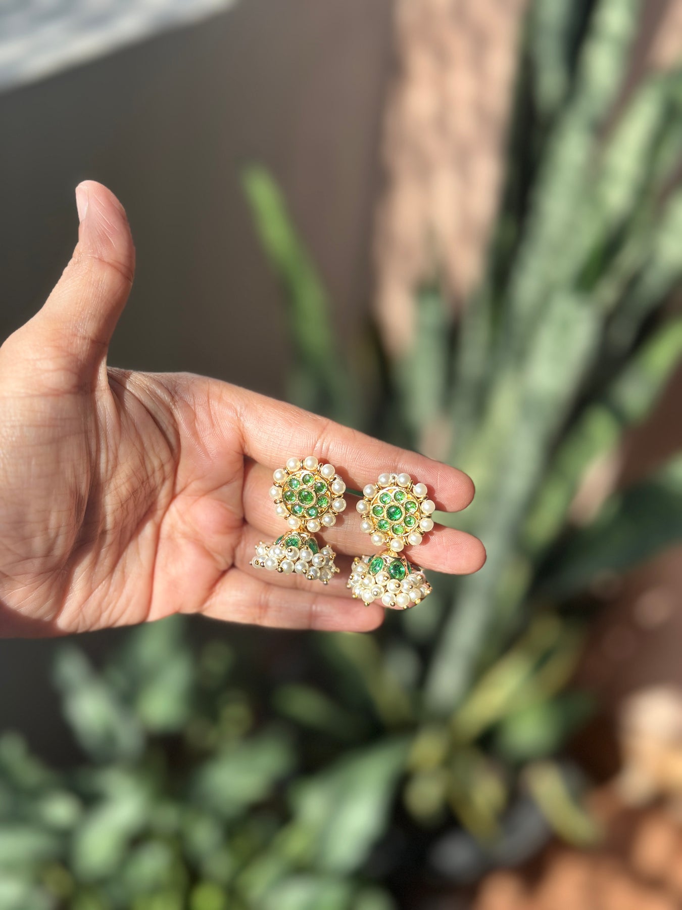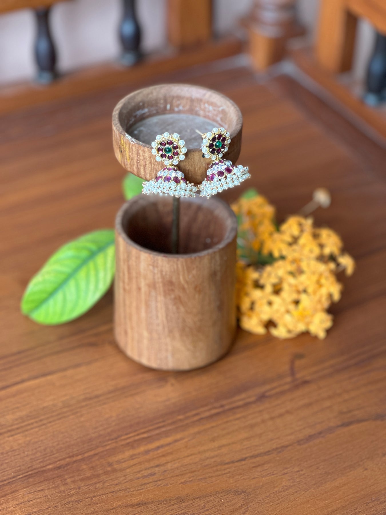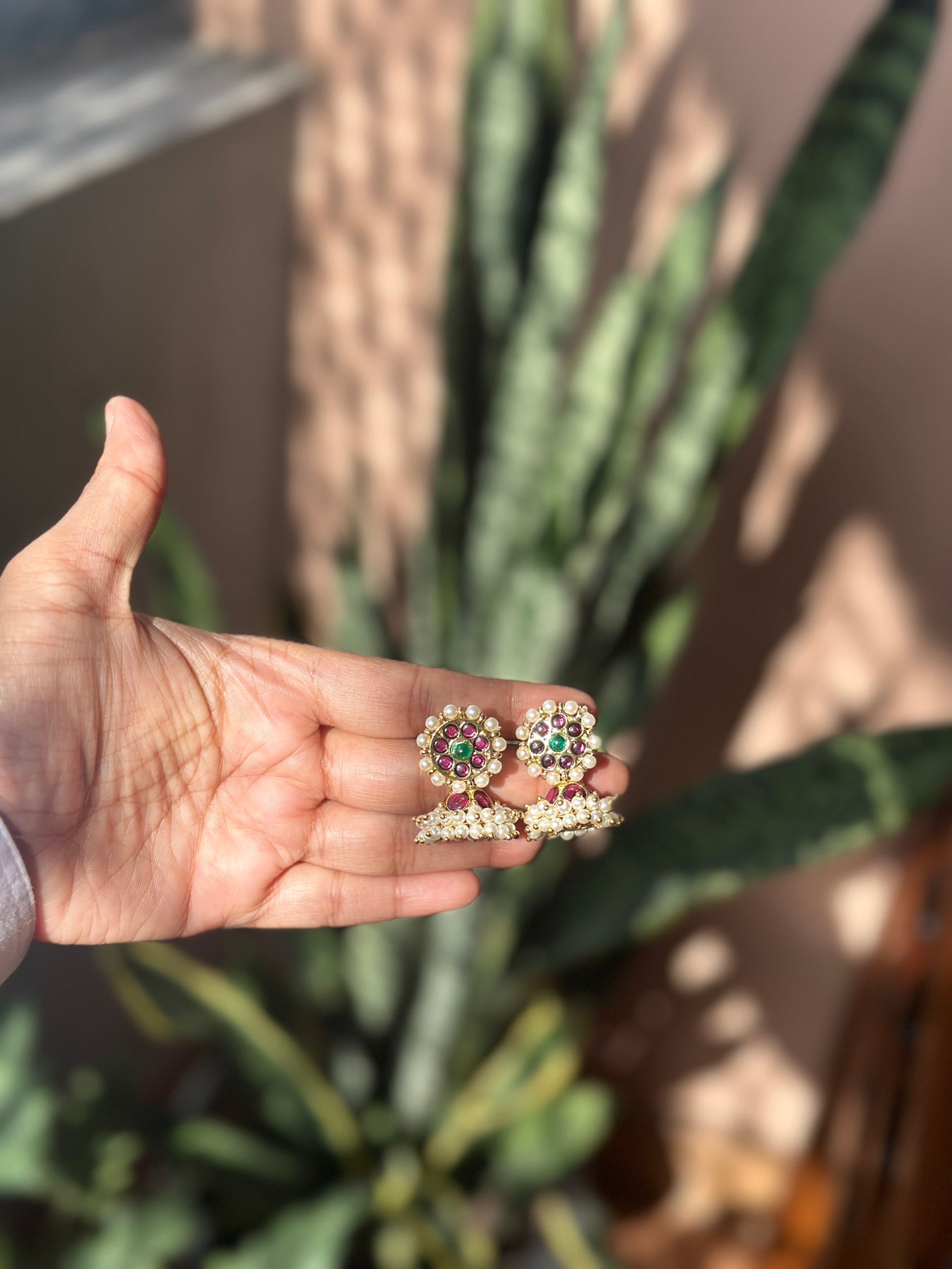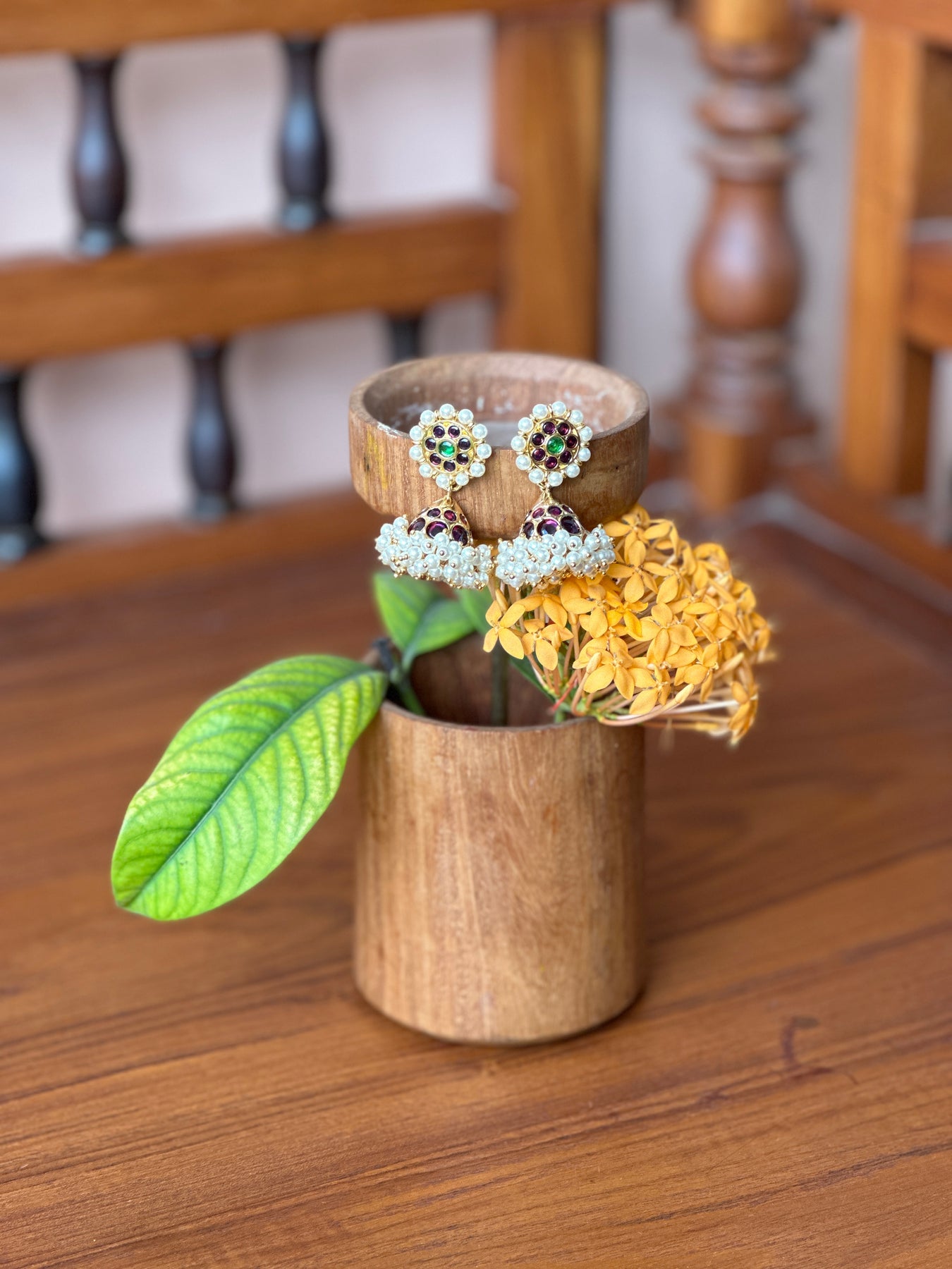 Ornate South Indian jhumkas, traditional earrings perfect for Bharatanatyam, Kuchipudi, and Tamil bridal wear, blending cultural richness with timeless elegance."