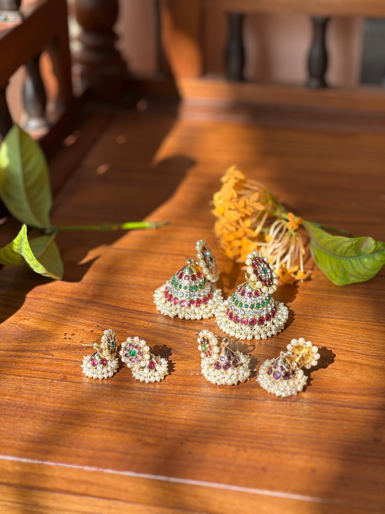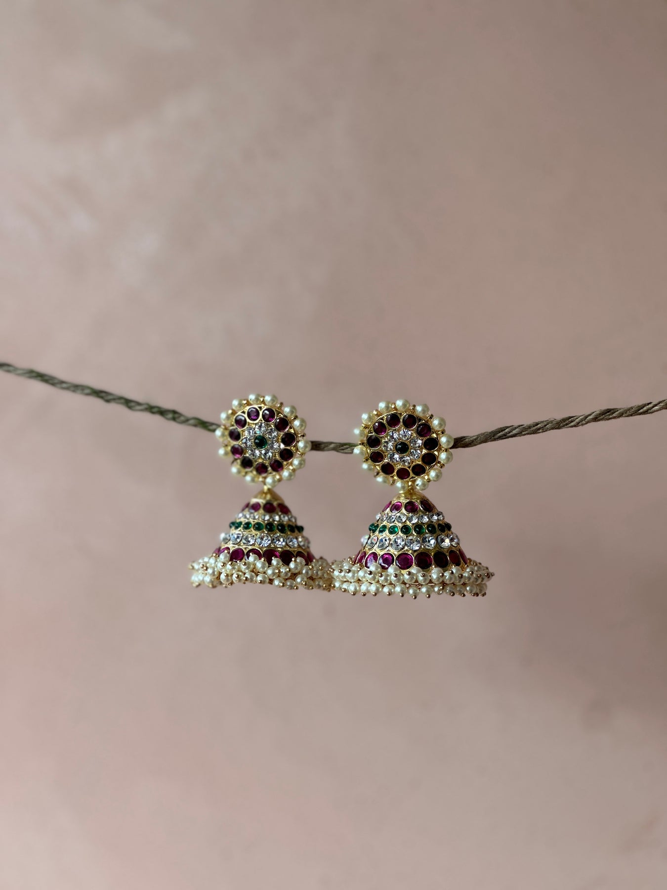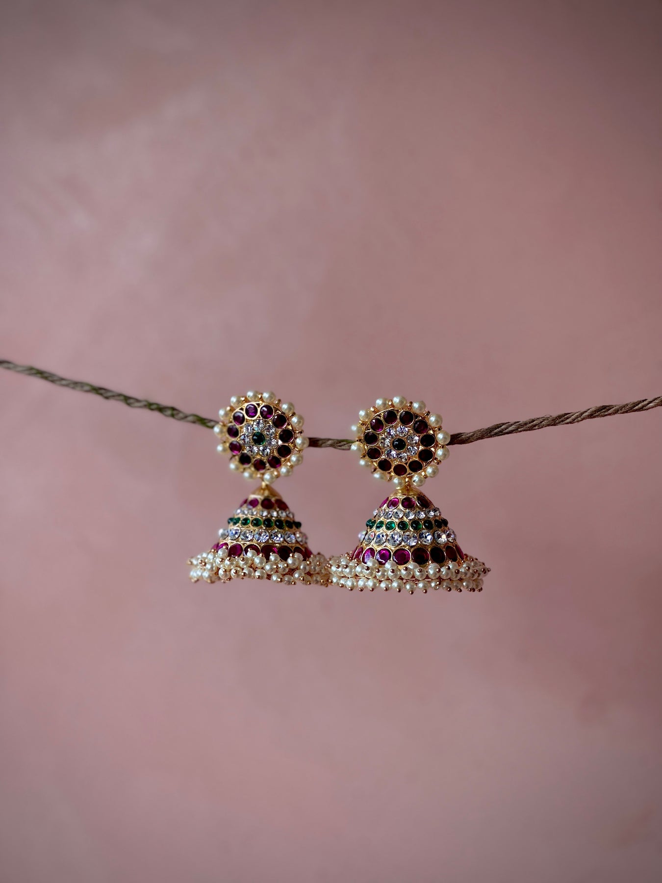 Ornate South Indian jhumkas, traditional earrings perfect for Bharatanatyam, Kuchipudi, and Tamil bridal wear, blending cultural richness with timeless elegance."