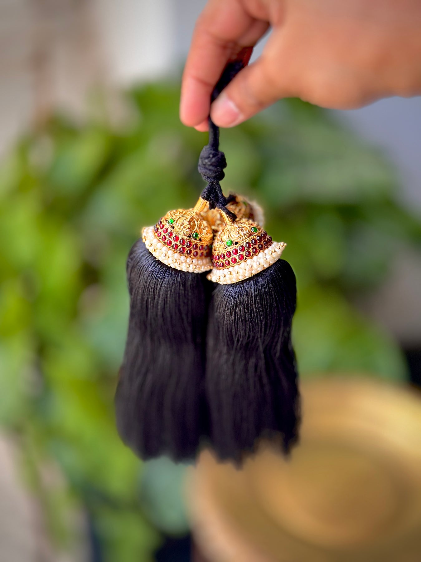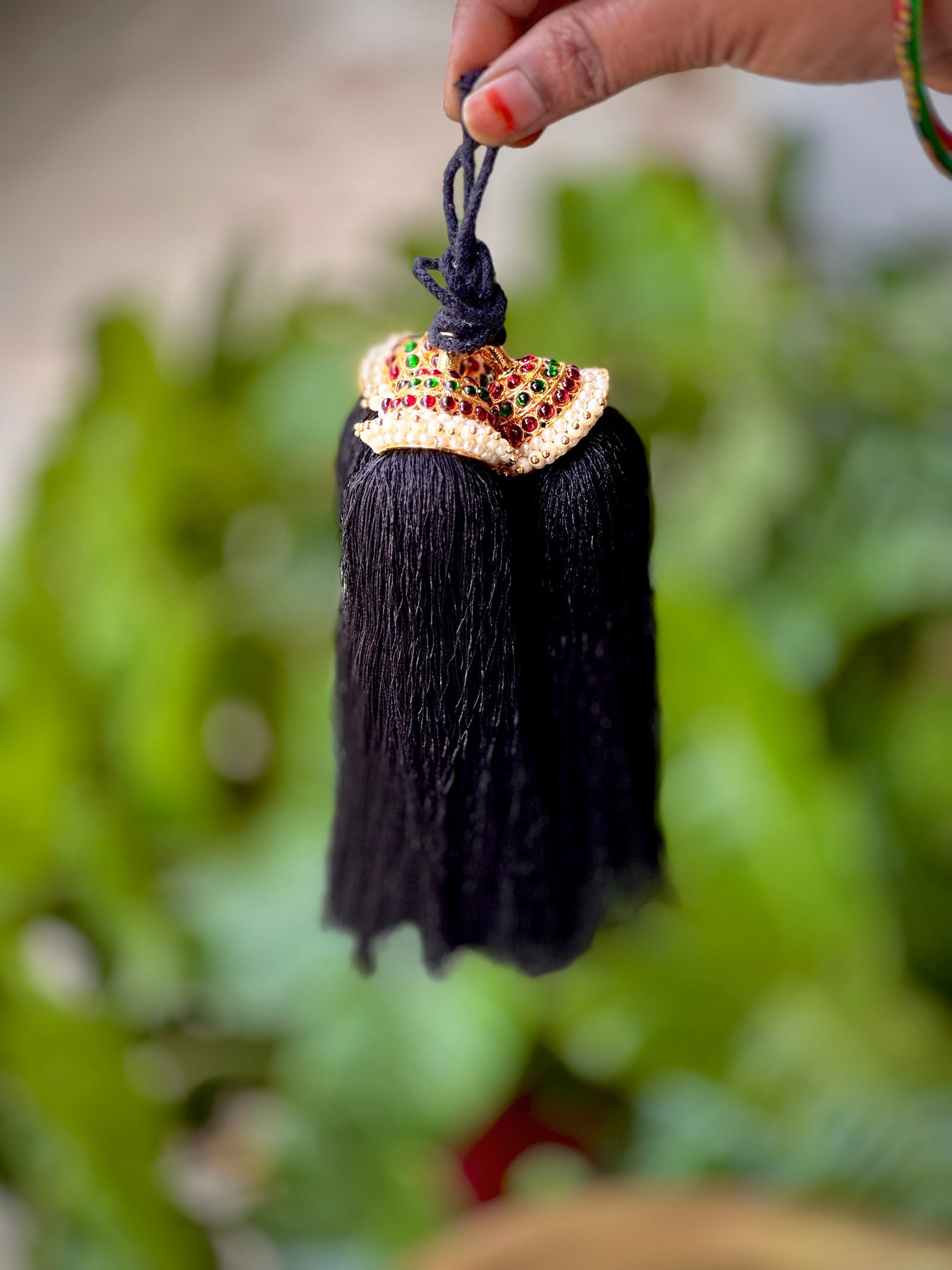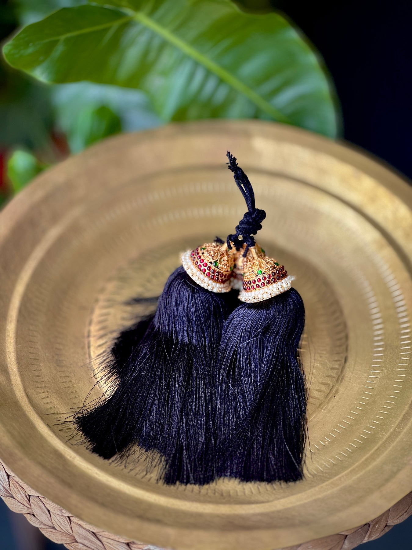 Classic black Kunjalam/Jada kuchulu with pearl and stone embellishments accents adds grandeur and elegance to your outfit
