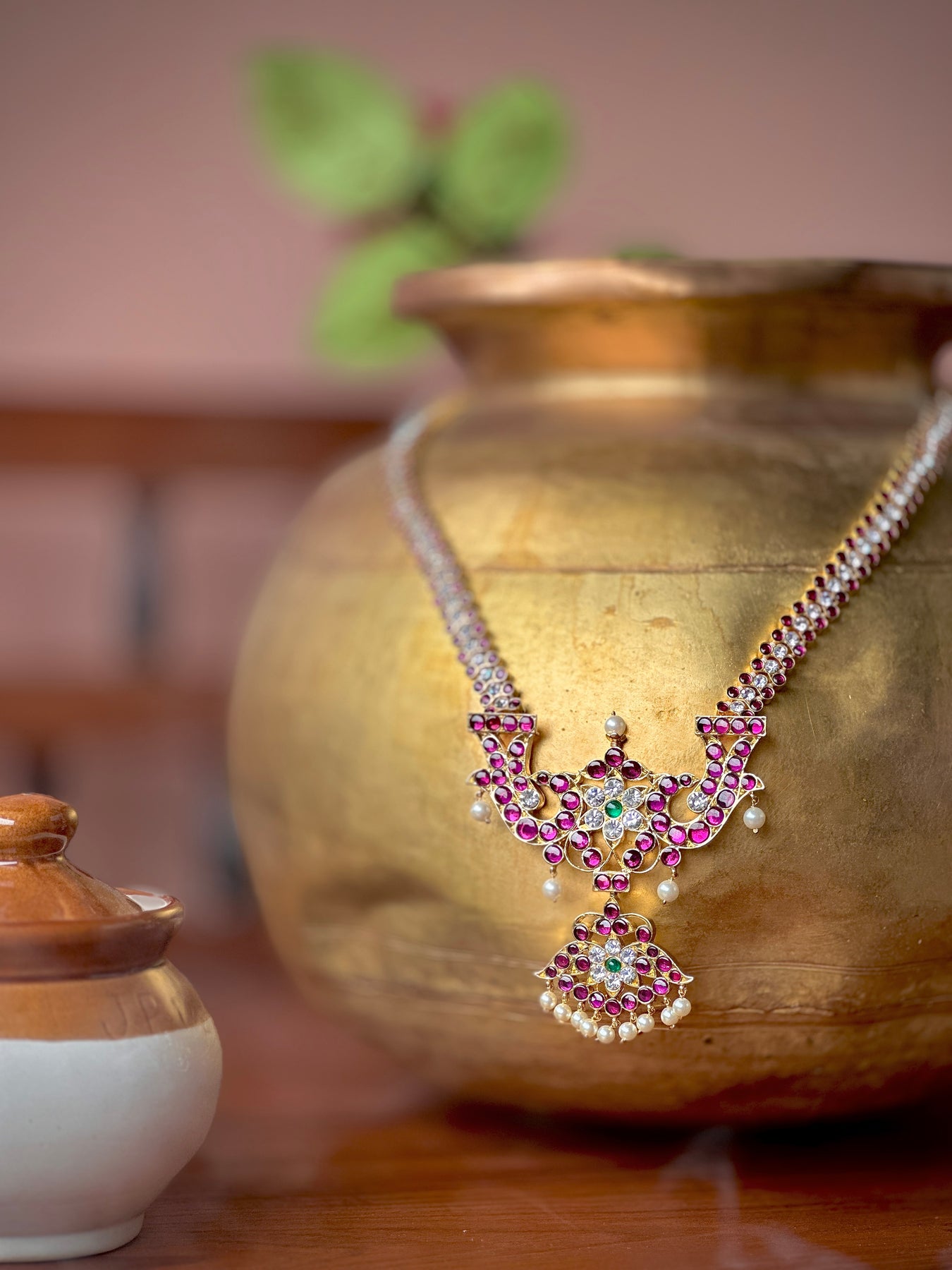 Regular price Rs. 27,550.00 Sale price Rs. 26,100.00 Save Rs. 1,450.00Elegant South Indian long chain (haram), a classic temple jewellery piece worn in Bharatanatyam and Kuchipudi performances, and by Tamil brides for traditional grandeur."