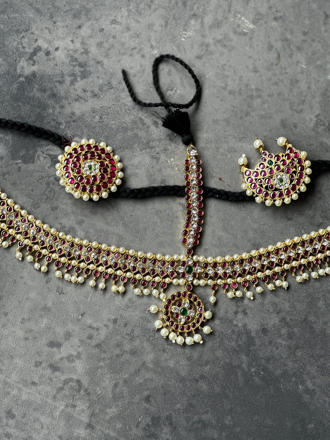 This quintessential dancer "talai saman" or headset without which any dancer's jewellery collection is incomplete! This 3 way maang tika is made in premium quality brass and will last you a life time without tarnishing and is a fraction of the price of original temple jewellery available in silver!