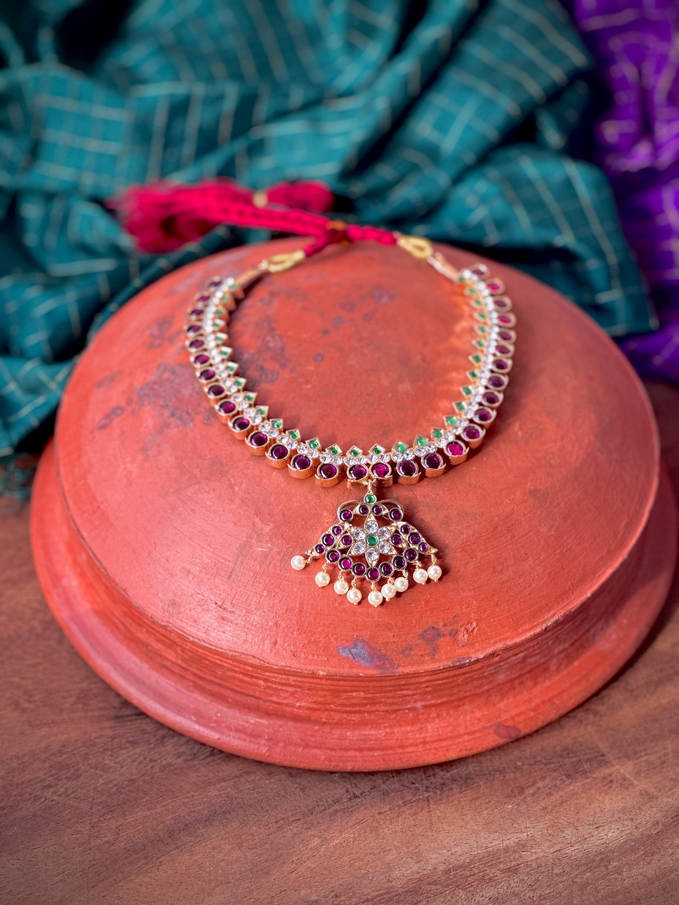 Regular price Rs. 14,500.00 Sale price Rs. 11,600.00 Save Rs. 2,900.00This double-sided addigai-style choker features a white stones on one side and vibrant kemp stones on the other, offering versatile elegance. Ideal for Bharatanatyam and Kuchipudi performers as well as Tamil brides, it delivers a lasting traditional appeal suitable for various occasions.
