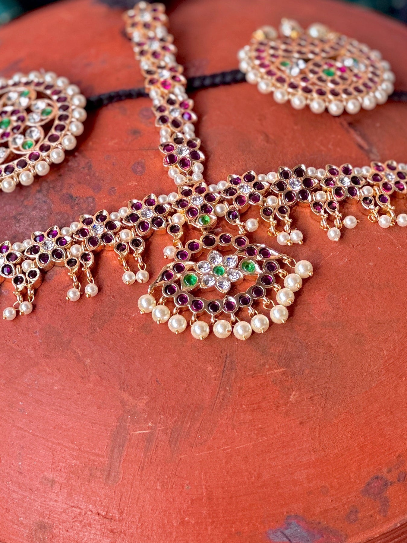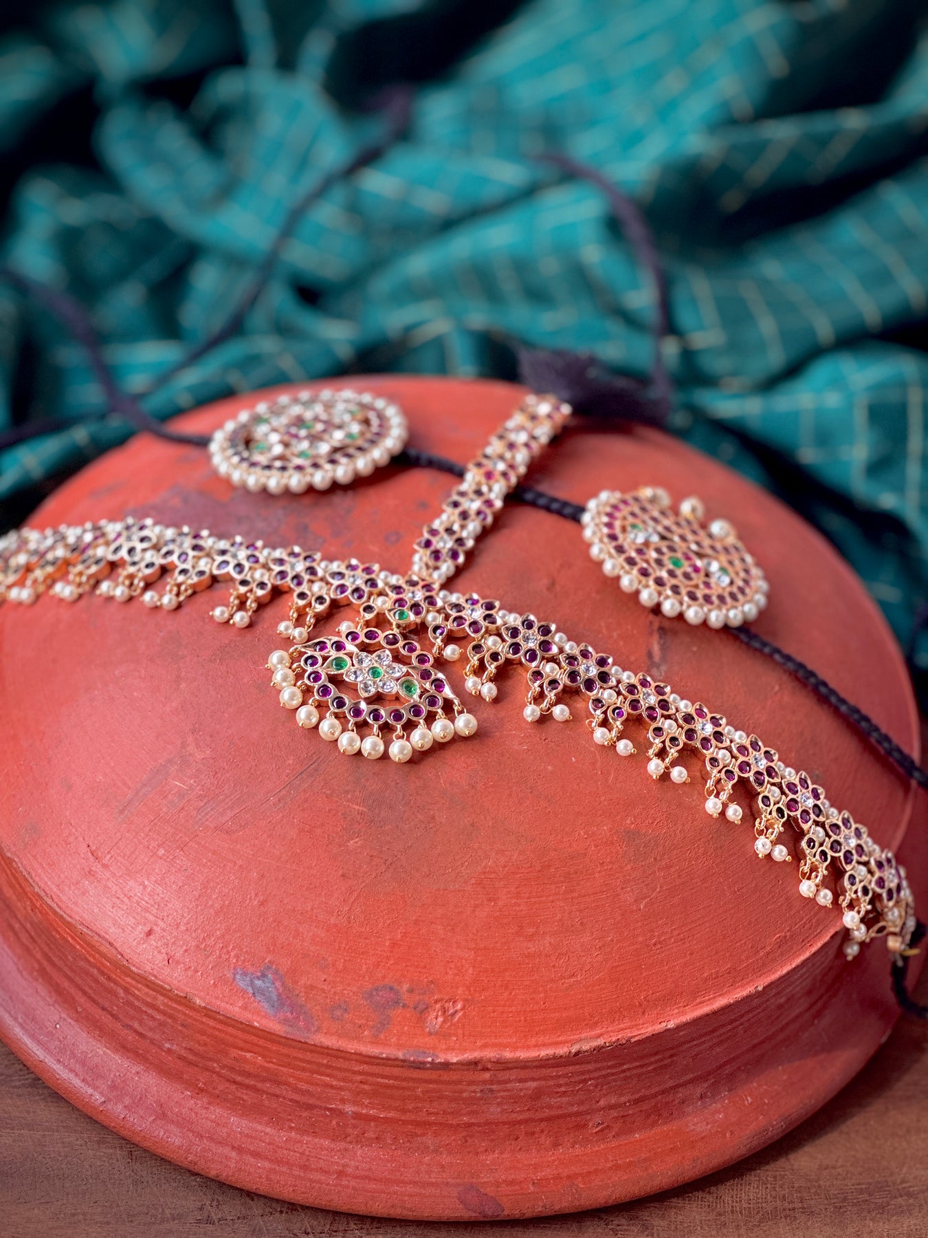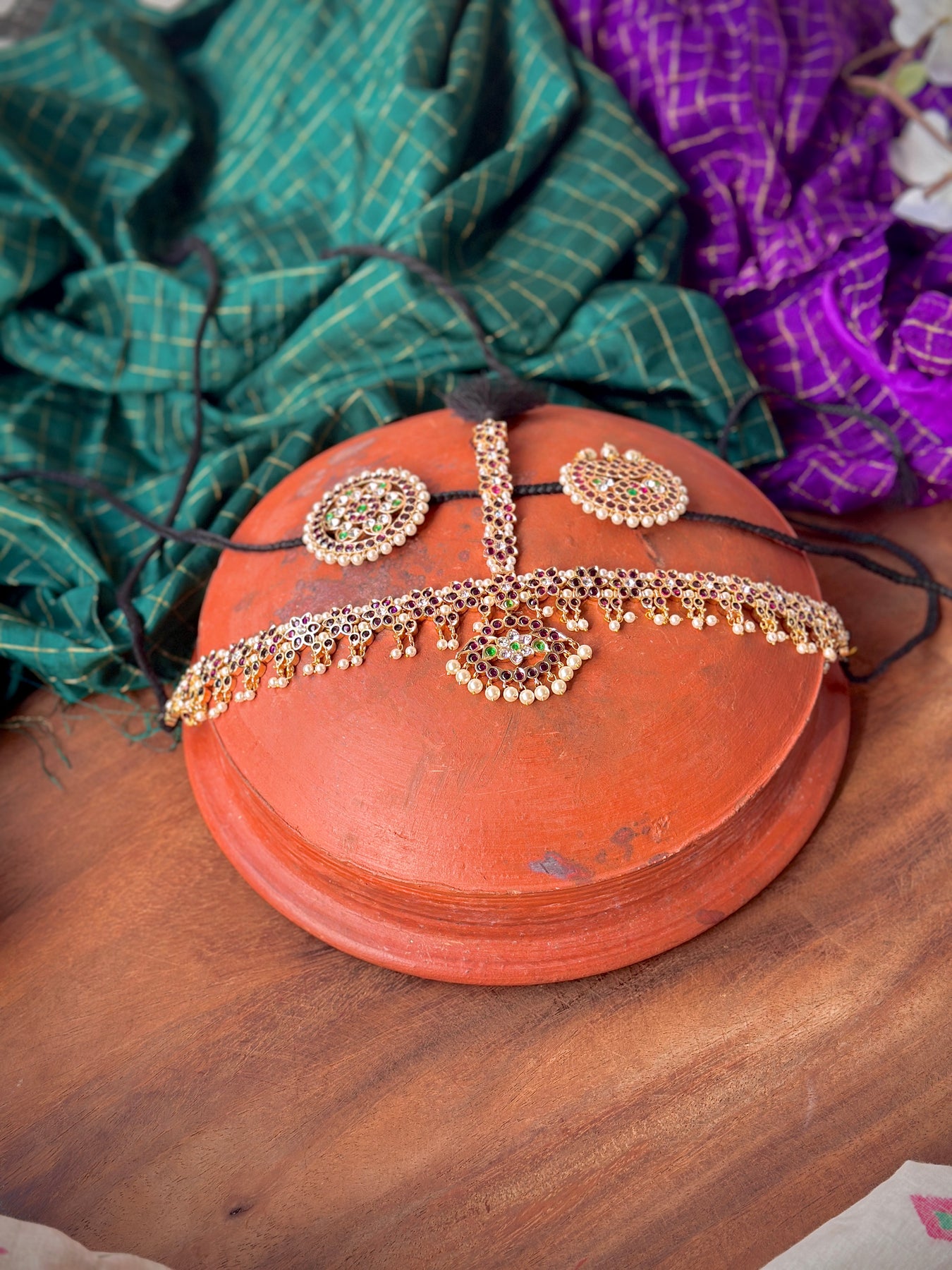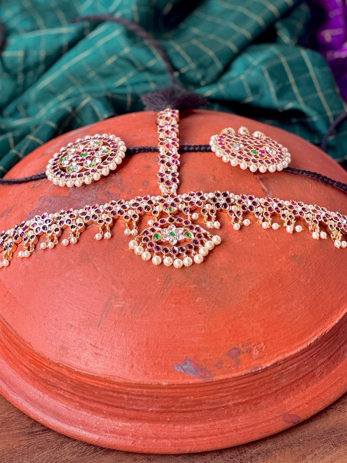 This quintessential dancer "talai saman" or headset without which any dancer's jewellery collection is incomplete! This 3 way maang tika is made in premium quality brass and will last you a life time without tarnishing and is a fraction of the price of original temple jewellery available in silver!