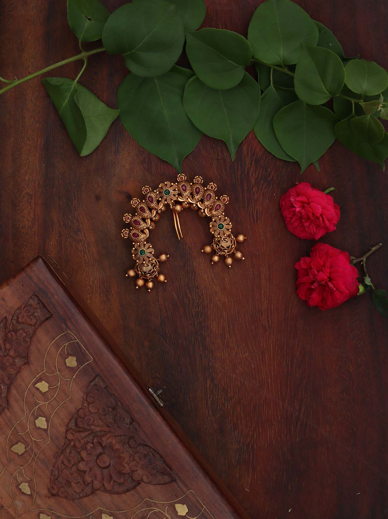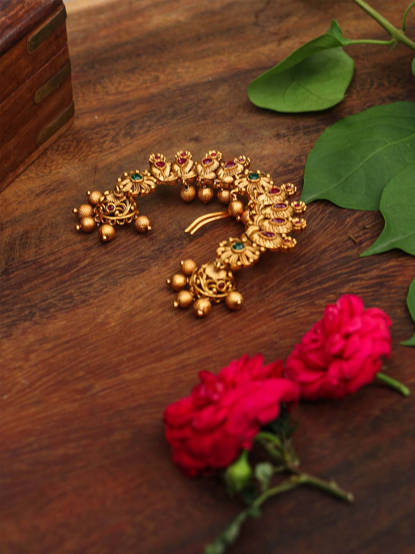 Regular price Rs. 1,400.00 Sale price Rs. 1,100.00 Save Rs. 300.00A U-Shaped matt gold juda pin with drop shaped motifs and large gold beads